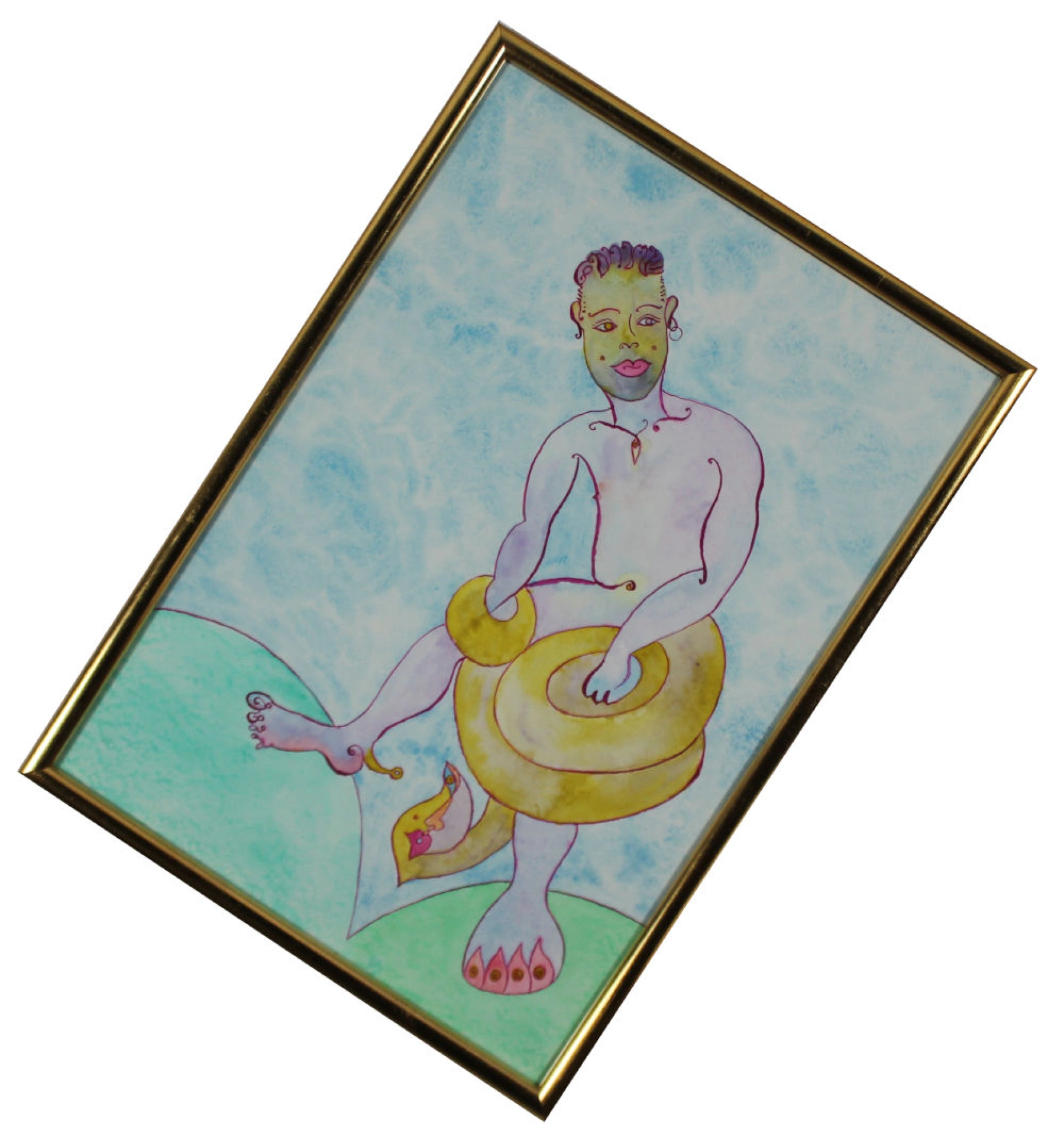 The title of this work by Luigi Ontani is understandable by observing the image of this watercolor. It is about a young man who has one elephant foot and the other that symbolizes a monkey, you can tell by the tail. The figure that is coiling around the boy is not a snake but the trunk of an elephant whose terminal part is nothing but Ontani's face. This situation is inspired by Ontani's travels in India where you can see elephants that coil their trunks around the driver and then place him on their backs.