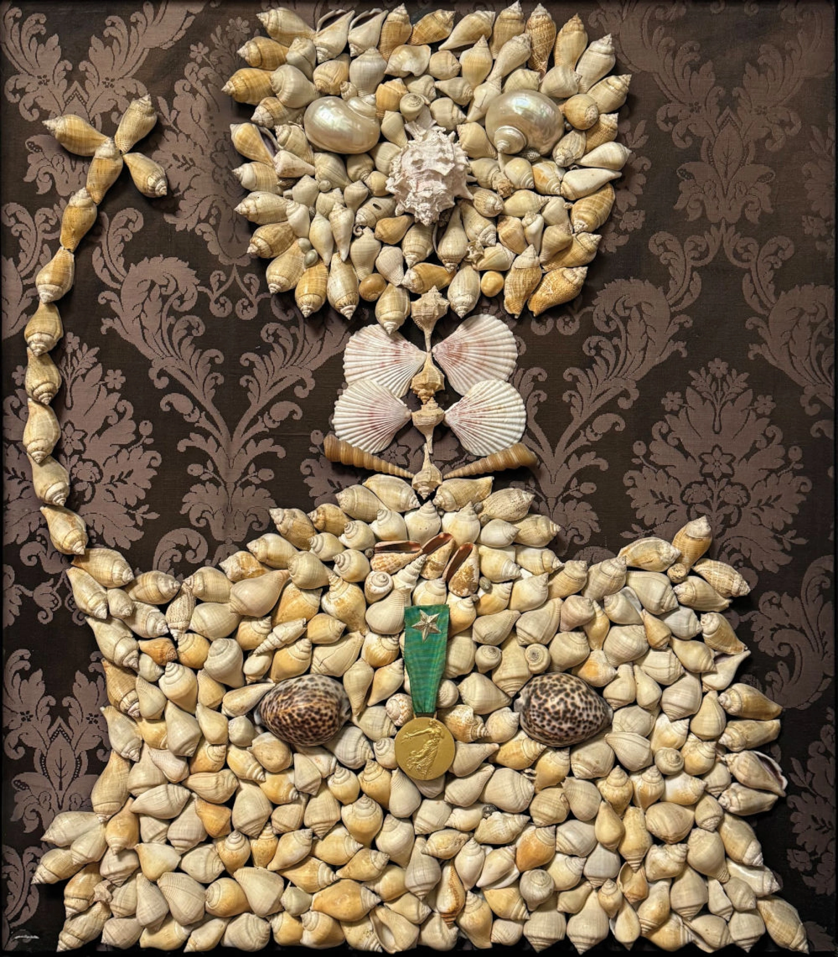 Technique : Technique mixte sur panneau, collage de coquillages et médaillon sur soie damassée. Tirage limité à 100 exemplaires, exemplaire n° 3.