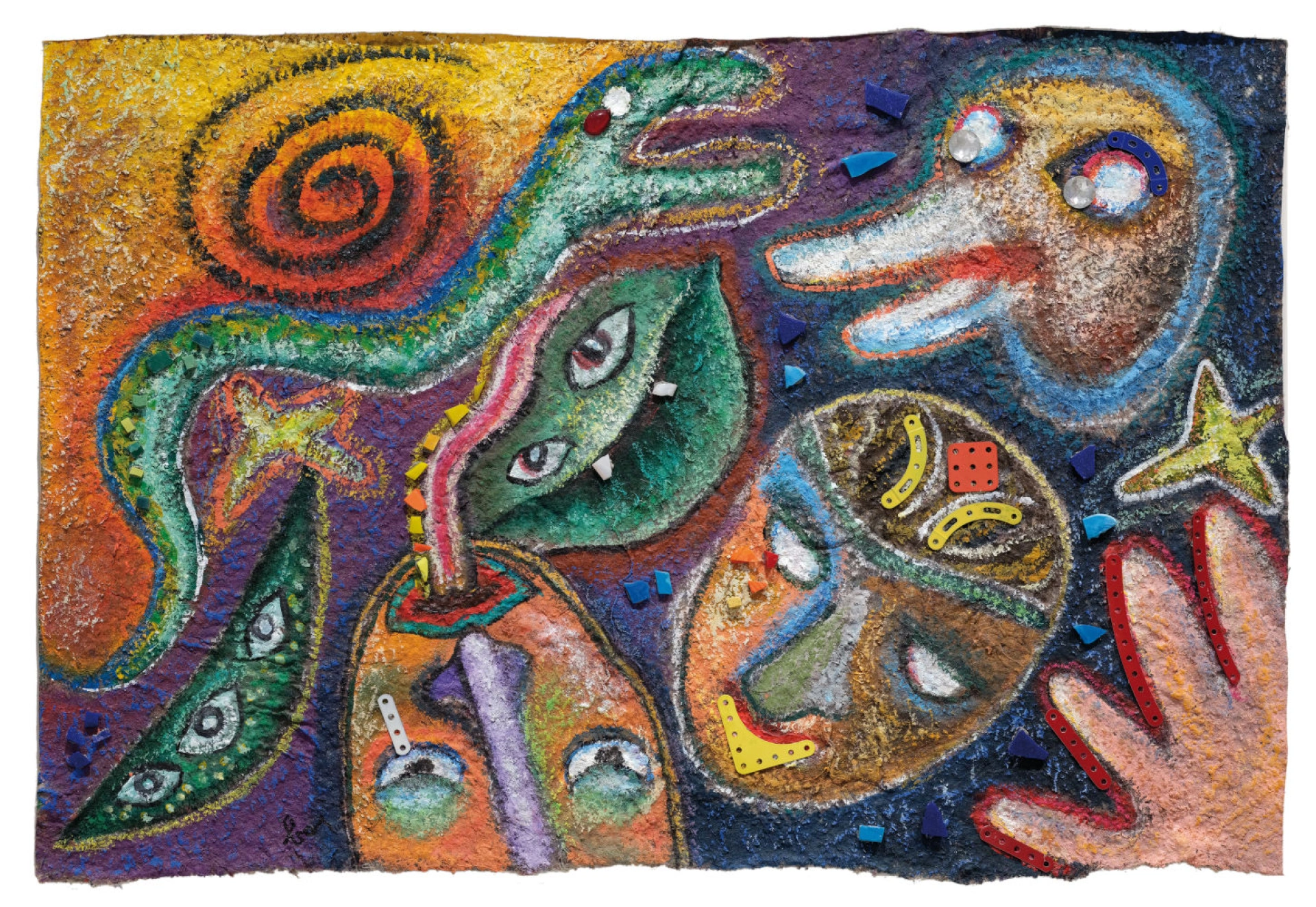 Technique : technique mixte avec des morceaux de verre et des garnitures sur papier peint