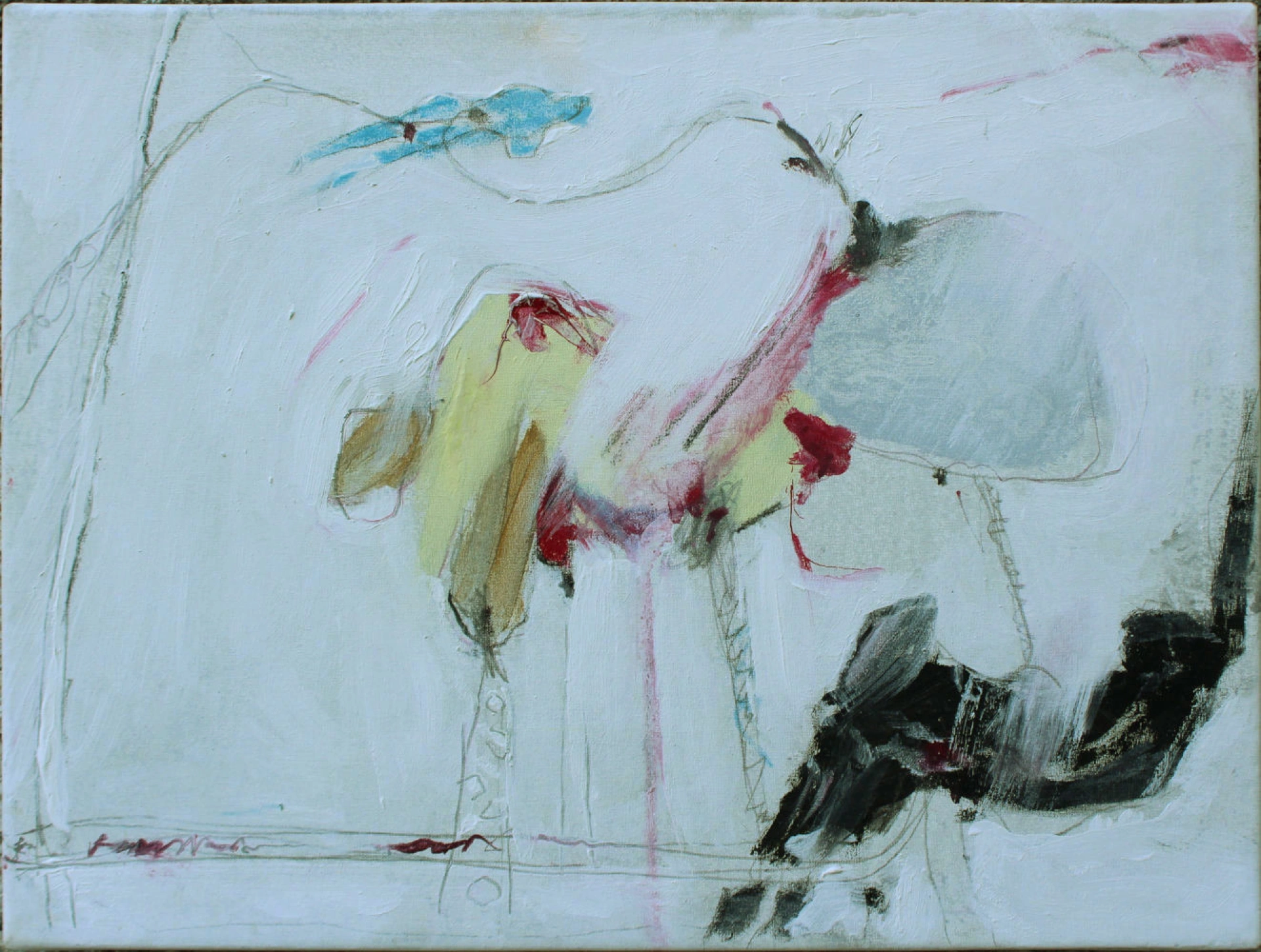 "Cordoni ombelicali" è il titolo che Mario Raciti dà a questa sua piccola opera. Tentiamo una interpretazione: nella parte centrale abbiamo due masse di colori che possono essere come sedi della" ragione" e del "sentimento". Queste sono collegate a due figure di donne, quella corposa in basso a destra e quella appena accennata in alto a sinistra. Delle linee congiungono queste figure alle due masse centrali, linee che possiamo immaginare come dei cordoni ombelicali che legano il sentimento e la ragione alla genitrice. In pratica ognuno di noi eredita dalla genetrice i geni del raziocinio e quelli cuore.