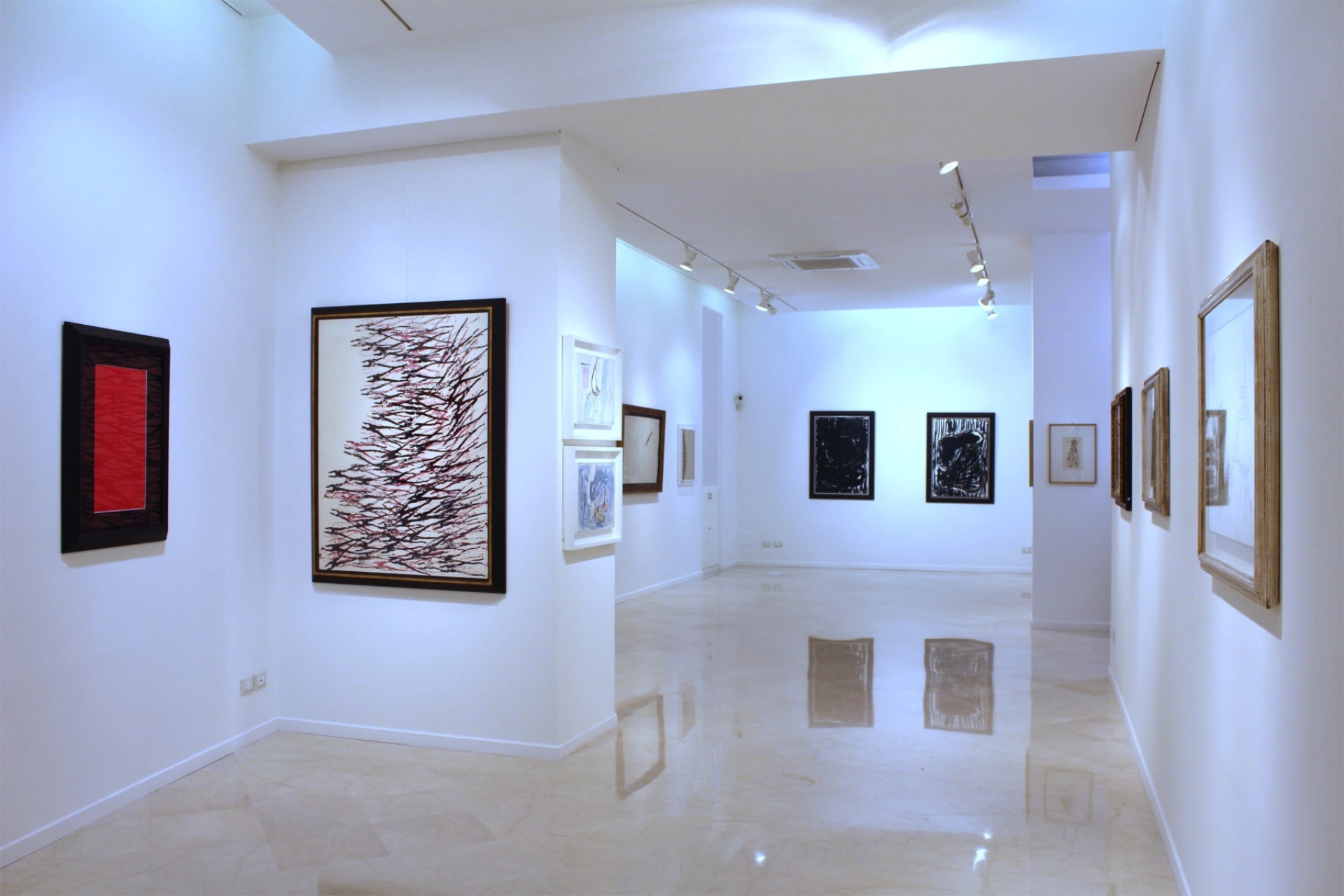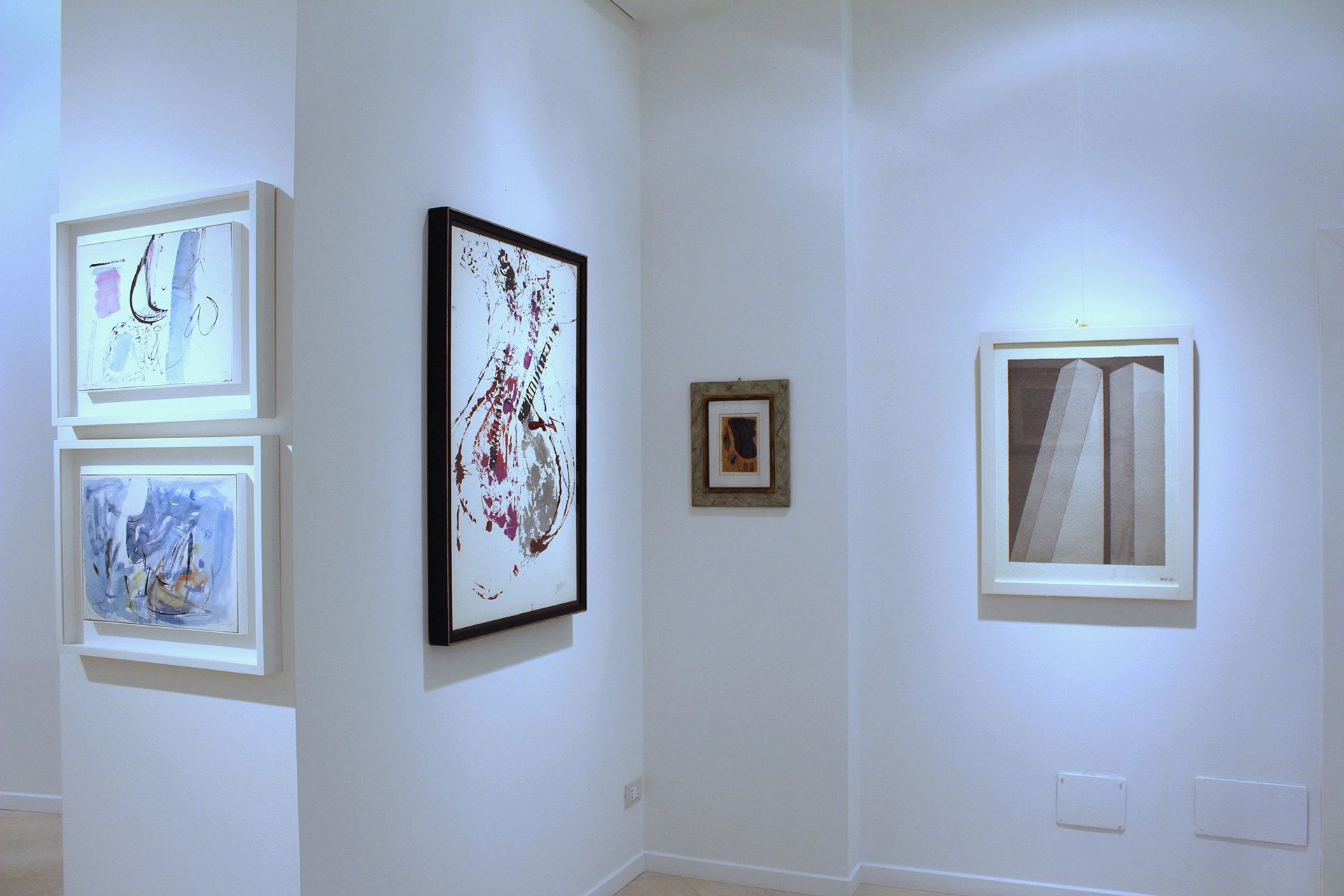 1910 primo acquarello astratto.Alcuni studiosi dibattono su quale sia la data precisa di quest’opera, forse andrebbe retrodatata di un paio d’anni o forse posticipata di altrettanti, comunque sia, la sostanza non cambia. Una delle opere capitali della storia del Novecento, anzi per molti, l’opera per eccellenza, è un acquerello su carta. Kandinsky si rese conto che, chiudendo gli occhi durante l’ascolto di “Lohengrin” di Wagner o del “Quartetto per archi” di Schonberg, una serie di lampi colorati si scatenava sullo sfondo nero del pensiero e il supporto cartaceo era quello che poteva garantire la risposta più rapida al tentativo di imprimere pittoricamente tale scenario. Ma prima di essere uno dei supporti della pittura, lo è stato della scrittura. La carta si colloca alla fine di quella catena evolutiva che ha visto succedersi la tavoletta incerata, il rotolo di papiro e la pergamena e che, forse, nel giro di qualche decennio verrà a sua volta scalzata dal digitale, chissà. Per ora, la carta rimane il supporto più accessibile per costo, reperibilità e trasporto. Tutti hanno imparato a scrivere sulla carta, hanno fatto esperienza di quale sia il suono della matita che scivola e incide un leggero solco sul foglio, ne hanno avvertito lo spessore e la fragilità, il profumo e il fruscio. Chiunque ha avuto modo di “mettere su carta” i propri pensieri per riorganizzare le idee e delineare quella nebulosa di pensieri che si amalgamano e si confondono nella mente. Per Jannis Kounellis, il supporto cartaceo non è utilizzato per la preparazione di bozzetti per opere più ampie o su altri supporti. Lui usa la carta per compiere studi sull’aspetto materico degli elementi più cari alla sua poetica. Analizza, ad esempio, come disgregare un nucleo centrale e creare un magma che evochi sia la materia bituminosa, sia una corporeità scultorea misurabile scientificamente. Le due opere in esposizione rappresentano i celebri sacchi di carbone, quelli che Kounellis si issò in spalla e con cui si fece fotografare in Messico, nelle vesti di un Atlante contemporaneo che sosteneva la zavorra di un’eredità culturale intenta a schiacciare l’artista sotto il suo peso. Lo stacco dei piani è riprodotto attraverso un cambio di direzione nel segno e l’unica fonte luminosa giunge dal fondo e scaturisce dal supporto cartaceo stesso che sembra retro illuminare la griglia verticale.