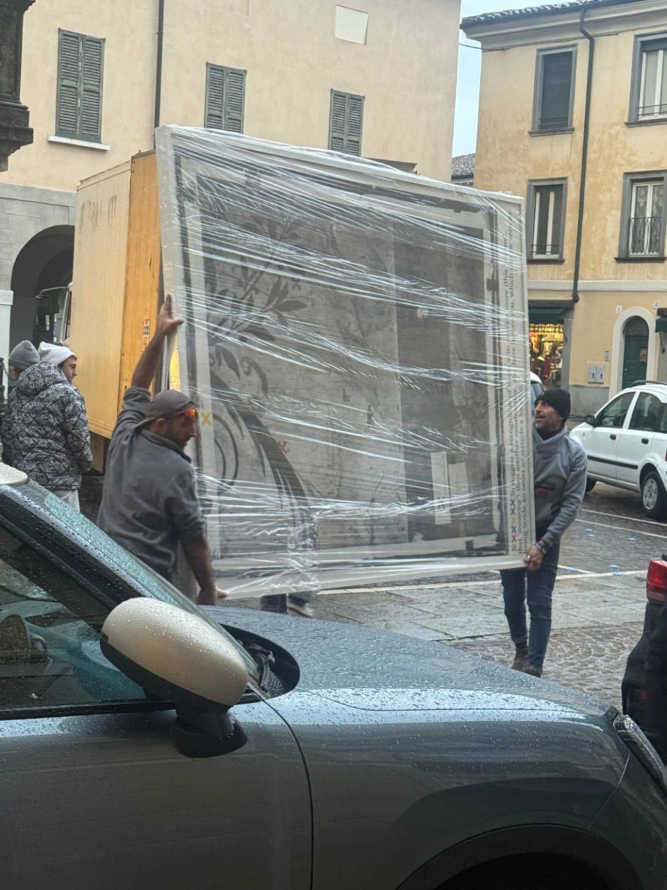 Nelle foto allegate i momenti dello spacchettamento e della messa in opera della ceramica di Luigi Ontani denominata "Arlecchino"