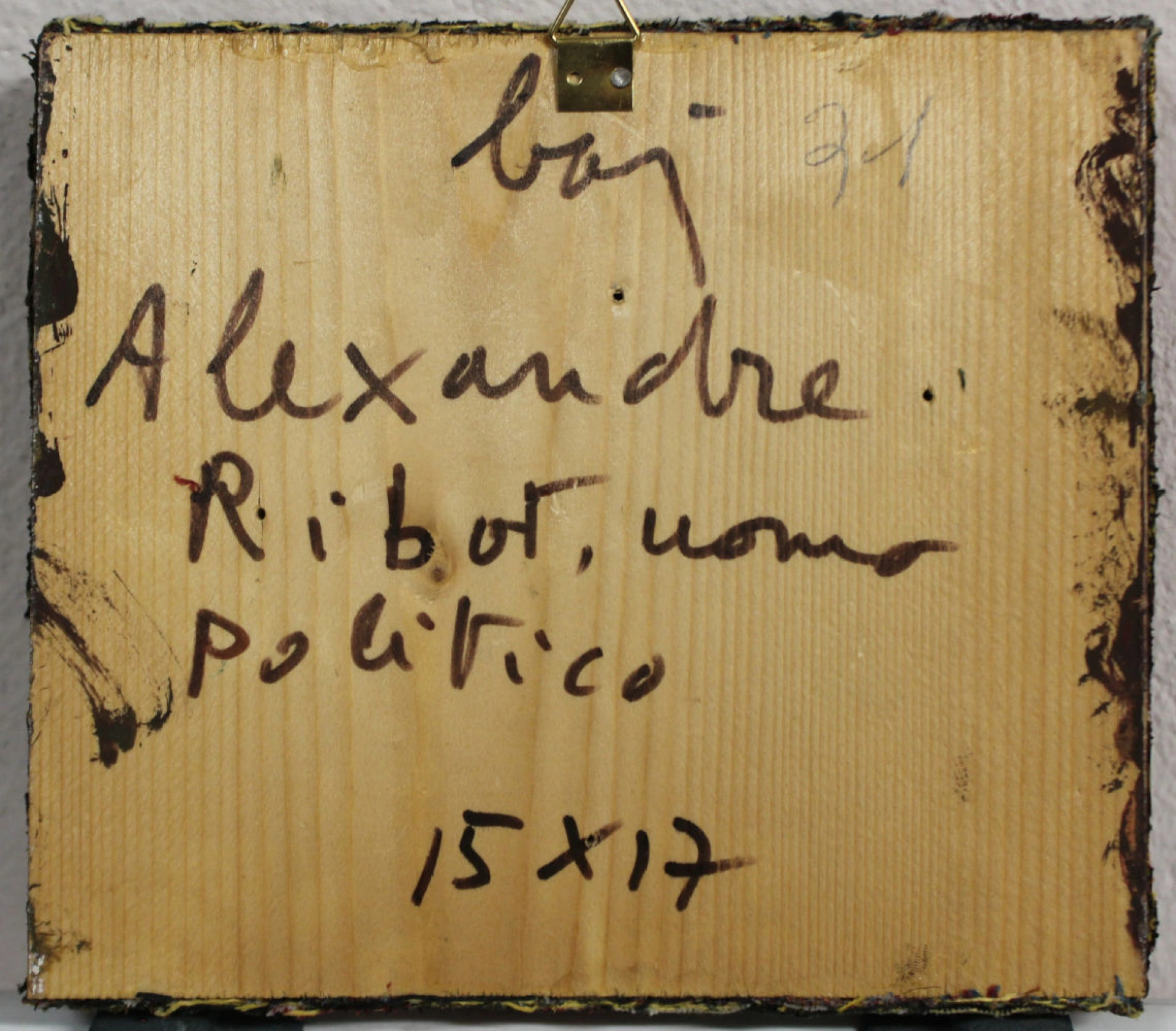 Questa piccola opera di Enrico Baj appartiene alla serie dei "Les Guermantes". Su una stoffa di arazzo incollata su una tavoletta, Baj opera dei collage di elementi e passamanerie in modo da riprodurre un volto. Particolarità di questa opera sono gli occhi con le pupille mobili quando la stessa viene mossa. L'effetto visivo è che lo sguardo sembra che segua il movimento dello spettatore.