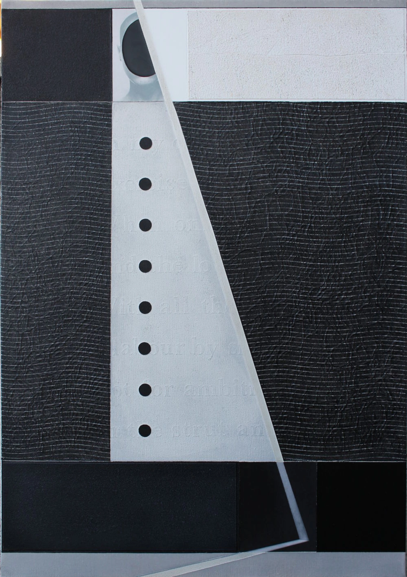Questa opera di Angelo Cagnone ha una struttura complessa. L'opera presenta due fasce orizzontali, una superiore che va dal grigio chiaro al nero ed una inferiore che va dal nero al grigio scuro. Cosa vuol dire Angelo Cagnone con queste due fasce simmetriche ed uguali per dimensioni? Il cambio di umore durante la giornata? Un espediente per rendere il quadro più mosso? Non lo sappiamo. In alto, quasi centralmente, c'è una foto di un viso di donna, ma il viso è nascosto da una macchia ovale nera che rende impossibile capirne l'espressione e le fattezze. Con questa trovata Angelo Cagnone lascia alla nostra immaginazione lo svelamento di questo viso, in altre parole ci vuole coinvolgere nella scoperta di una parte significativa dell'opera. Sotto il viso nascosto Angelo Cagnone costruisce un triangolo rettangolo grigio chiari con delle scritte e dei pallini neri sulle scritte che non permettono di identificarne il significato. Questo triangolo rappresenta una interruzione di una giornata piuttosto grigia simboleggiata dal nero grumoso a destra e a sinistra?. Una interruzione dovuta ad una visita inaspettata o a un momento di riposo e di riflessione sull'opera in costruzione? A rendere meno funereo questo nero pece, Angelo Cagnone traccia delle sottili linee ondulatorie bianche, forse riflesso condizionato del mare della Liguria, sua terra natale bagnata dal mare.