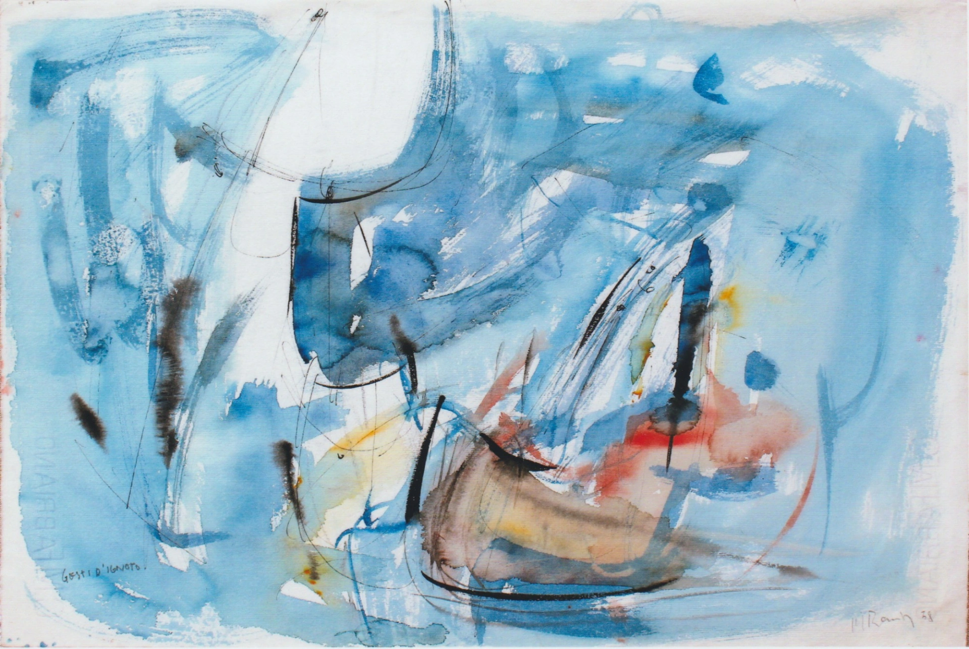 Mario Raciti classifica come "Gesti d'ignoto" le prime opere che erano dei tentativi per trovare il proprio linguaggio espressivo. Erano delle prove, un insieme di linee e colori che si stendevano sulla carta senza una base mentale o una logica di ispirazione. Erano degli esercizi per capire da dove partire e dove approdare. Queste macchie di colori, queste linee senza senso sono comunque di un certo fascino e sono anche importanti per capire la pittura "adulta" di Mario Raciti. Con questa definizione, "Gesti d'Ignoto" Mario Radice quasi disconosce la paternità delle opere in quanto si tratta di un artista che lui ancora non conosce e quindi "ignoto". Nel caso di questa opera è predominante la tonalità del blu